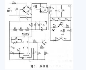原理圖如圖1所示,它由如下元件構成:C1,V1~V4,C2組成濾波整流電路,變壓器T為高頻變壓器,V5,R2,C11組成功率開關管V7的保護電路,NF為供給IC電源的繞組。單端輸出IC為UC3842,其8腳輸出5 V基準電壓,2腳為反相輸入,1腳為放大器輸出,4腳為振蕩電容C9,電阻R7輸入端,5腳為接地端,3腳為過流保護端,6腳為調寬單脈沖輸出端,7腳為電源輸入端。R6、C7組成負反饋,IC啟動瞬間由R1供給啟動電壓,電路啟動后由NF產生電勢經V6,C4,C5整流濾波后供給IC工作電壓。R12為過流保護取樣電阻,V8,C3組成反激整流濾波輸出電路。R13為內負載,V9~V12及R14~R19組成發光管顯示電路。V5,V6選用FR107,V8選用FR154,V7選用K792,當V7導通時,整流電壓加在變壓器T初級繞組Np上的電能變成磁能儲存在變壓器中,在V7導通結束時,Np繞組中電流達到最大值:Ipmax:Ipmax=(E/Lp)ton式中:E為整流電壓;Lp為變壓器初級繞組電感;ton為V7導通時間。在V7關閉瞬間,變壓器次級繞組放電電流為最大值Ismax,若忽略各種損耗應為:Ismax=nIpmax=n(E/Lp)ton。式中:n為變壓器變比,n=Np/Ns,Np,Ns為變壓器初、次級繞組匝數。高頻變壓器在V7導通期間初級繞組儲存能量與V7關閉期間次級繞組釋放能量應相等:n(E/Lp)ton=(Uo/Ls)toff,式中:Ls為變壓器次級繞組電感;Uo為輸出電壓;toff為V7關閉時間。