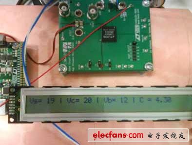 圖 6:LCD 讀數:Vs (太陽能電池板電壓);Vc (充電電路電壓);Vb (電池電壓);C = 充電電流 (4.3A),用DC590B PIC 微控制器控制;用 LTC2418 演示板 DC571 ADC 讀取電壓,該演示板由 LTM4601演示板 DC1041A 微型模塊降壓型穩壓器供電。