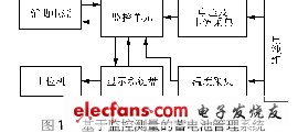 在給電池充電的過程中,涉及到電池工作電壓、工作電流、溫度等參數,這些都是表征電池狀態的重要參數。采用傳感器提取這些參數,然后再配合故障診斷、遙控遙測、自動報警和事故現場處理等功能,就可以組成一個電池管理系統。如圖1所示。