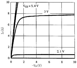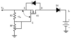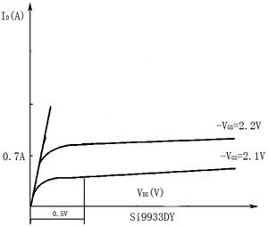 擴(kuò)流部分電路如圖3所示。它由P溝道功率MOSFET(VT)、R及RP組成的分壓器、肖特基二極管D4組成。利用分壓器調(diào)節(jié)P-MOSFET的-VGS大小,使獲得所需擴(kuò)流電流ID。P-MOSFET的輸出特性(以Si9933DY為例)如圖4所示。在-VGS=2.1V、VDS>0.5V時(shí),其輸出特性幾乎是一水平直線;在不同的VDS時(shí),ID是恒流。從圖4也可以看出,在-VGS增加時(shí),ID也相應(yīng)增加。