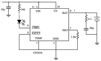 若充電率在0.5~1C之間、電池的溫度在0~45℃之間(室溫充電),則CN3056充電器電路中可省去電池溫度檢測(cè)電路及電池超溫指示電路(引腳TEMP及FAULT端接地),電路如圖1所示。VIN是電源輸入端、CE是使能端,(高電平有效);RISET為充電電流ICH設(shè)定電阻,RISET(Ω)=1800(V)/ICH(A);CHRG為充電狀態(tài)信號(hào)輸出端:充電時(shí)此端為高電平,LED亮;充電結(jié)束時(shí)此端為高阻抗,LED滅;電池未裝入或接觸不良,LED閃亮。VIN一般取4.5~5V,10μF及6.8μF為輸入、輸出電容,保證充電器穩(wěn)定工作。