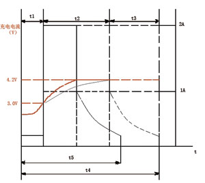 原充電器以1A電流充電,若擴(kuò)流電流為1A,則在恒流充電階段時(shí)充電電流為2A。圖5中紅線為充電電池電壓特性、黑線為充電電流特性,實(shí)線為加擴(kuò)流特性,虛線為未加擴(kuò)流特性。從圖5可看出:擴(kuò)流的充電時(shí)間t5比不擴(kuò)流的時(shí)間要短(圖5中的時(shí)間坐標(biāo)并未按比例畫);并且也可以看出:擴(kuò)流僅在恒流充電階段進(jìn)行。