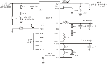 降壓開關穩壓器輸出為1.8V(@400mA),降壓-升壓開關穩壓器輸出為3.3V(@400mA)。在IC引腳SWAB2與SWCD2之間連接的2.2μH的電感器為降壓-升壓穩壓器的輸出電感器。NTC熱敏電阻(R25=100kΩ)的偏置電阻分別為110kΩ和28.7kΩ,故充電器的熱和冷解扣點分別設置在55℃和0℃。在IC引腳BAT上連接的1Ω的電阻和4.7μF的電容,可保證充電器穩定。