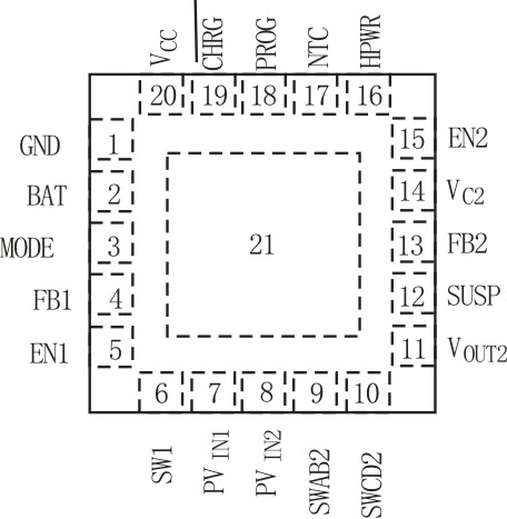LTC3558采用3mm×3mm×0.75mm的21引腳QFN封裝,引腳排列如圖1所示。