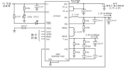 其充電器的充電電流可達950mA,降壓開關穩壓器的輸出為1.2V(@400mA),降壓-升壓開關穩壓器的輸出為3.3V(@400mA)。充電器通過NTC熱敏電阻將電池溫度解扣點設置在0℃和40℃,LED用作充電狀態指示。