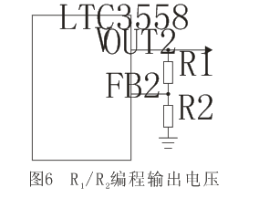 LTC3558的降壓-升壓開關穩壓器在電壓模式和2.25MHz的固定頻率上操作,能提供直到400mA的輸出負載電流,輸出電壓可在2.75V與5.45V之間來編程,其值為VOUT2=0.8V(1+R1+R2)。R1與R2為IC引腳FB2上的分壓器電阻,如圖6所示。