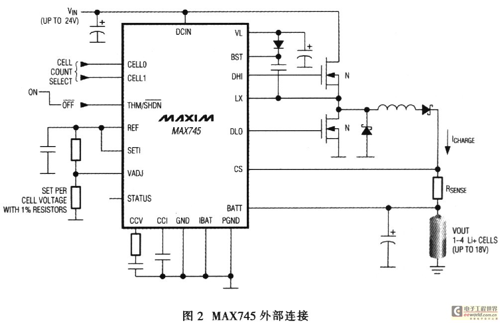 開關(guān)方式充電器,以MAX745,MAXl757為例,如圖2所示。相比線性調(diào)節(jié)方式,開關(guān)方式控制外部MOSFET對源電壓進行斬波,然后將斬波后的電壓進行濾波,產(chǎn)生所需要的充電電流或電壓。MOSFET工作與開關(guān)狀態(tài),大大減小了調(diào)整管的功耗,但開關(guān)方式充電器的功耗降低是以增加電路尺寸和復(fù)雜度為代價。
