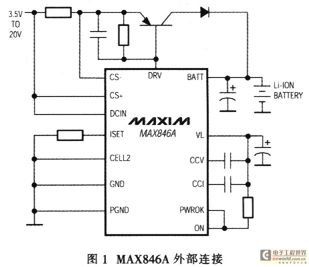 線性調(diào)節(jié)方式,例如MAXl898,MAX846A等,線性調(diào)節(jié)方式的充電器的充電電壓或電流來自于交流適配器的直流輸出,通過控制外部PNP調(diào)整管,調(diào)節(jié)電池的充電電流以及充電電壓,如圖l所示,具有結(jié)構(gòu)簡單,外圍元件少等優(yōu)點,但外部的調(diào)整管工作在線性方式下,具有較高的功耗,因此該充電方式的效率較低,發(fā)熱相對較大,用于小型便攜式設(shè)備,例如手機、個人數(shù)字助理(PDA)等,會造成較大的溫升。