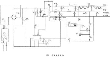 本系統(tǒng)采用TOFSwitch―GX系列PWM開關(guān)控制電路來實現(xiàn)220V交流電到低壓直流電壓的轉(zhuǎn)換,克服了采用傳統(tǒng)工頻變壓器的體積龐大,效率低,發(fā)熱量大的缺點。開關(guān)電源電路如圖2所示。開關(guān)電源有兩路輸出:一路輸出電壓為5V,用于對MCU進行供電;一路輸出電壓為30V,此路電源有兩個用途:通過PWM控制電路對電池進行充電和經(jīng)過穩(wěn)壓電源芯片7818的轉(zhuǎn)換對采用電路和PWM控制電路進行供電。