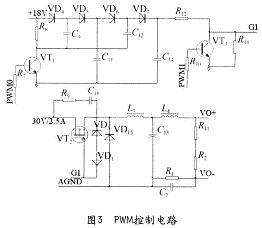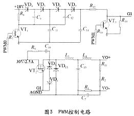控制電路的控制芯片采用的是帶有AD和PWM口的STC12C2052AD單片機。使用單片機的四個AD來采集電池的電壓、充電電流、電池的溫度和環(huán)境溫度??刂浦麟娐啡鐖D3所示。VT2(IRFZ44)正常工作時,VGS必須大于2V,因此系統(tǒng)采用了升壓電路把l8V電壓升壓為36V電壓。當G1端的電平為低時,VT2處于關(guān)閉狀態(tài),這時候停止對電池充電。當Gl端的電平為高時,IRFZ44處于導(dǎo)通的狀態(tài),這時候處于對電池的充電狀態(tài)。因此通過控制PWM的占空比,就可以控制VT2的導(dǎo)通時間,進而控制充電電流。