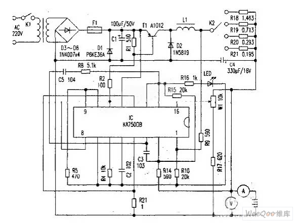 電路如附圖所示:此鋰電池充電板原用于汽車(chē)電源給手機(jī)7.2V鋰電池充電,其充電過(guò)程是先恒流充電,再恒壓緩充,最后恒壓浮充。根據(jù)其原理,再增加電源變壓器、整流濾波電路、電阻R17~R21、W1、電壓表、電流表等元件,使之成為一款輸出電壓在DC2V~DC15V,輸出電流在100mA、200mA、500mA、1.5A四擋可變的充電器。