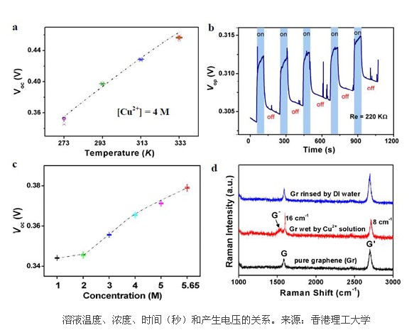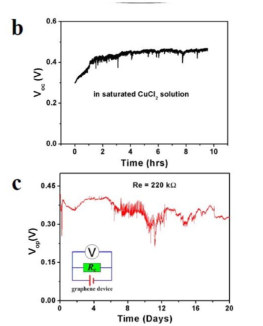 石墨烯電池在飽和氯化銅溶液中,時間(小時、天數)和產生電壓的關系。來源:香港理工大學