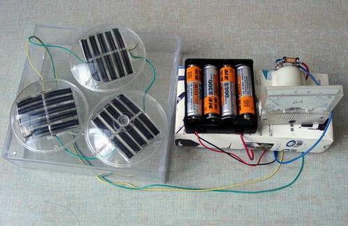 為節約能源,試用太陽能給鎳氫電池充電。 最關心的是這樣做的成本多少,效果如何。試下來還算比較滿意的。太陽能電池用了3個單元串聯使用,這太陽能電池單元購于東明,一共30元。在陽光下空載輸出的最高電壓超過了7V。這樣用這個太陽能電池對鎳氫電池組充電,充電電池是四節鎳氫電池串聯。串聯一個電流表監視充電電流(100uA表頭并聯電阻改為100mA電流表)。沒有什么線路,直接把電池組和太陽能電池組并聯就可以了。