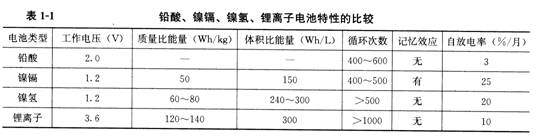 表1。l為鉛酸、鎳銅、鎳氫、鋰離子電池特性的比較。