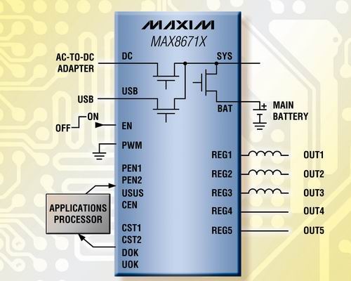 Maxim推出MAX8671X 高度集成的電源管理IC (PMIC)。該器件可提供單節鋰離子(Li+)/鋰聚合物(Li-Poly)充電器,內置專有的Smart Power Selector?電路可實現系統內電源的無縫分配。為降低BOM成本,MAX8671X集成三路2MHz、降壓型DC-DC轉換器以及兩路低靜態電流線性穩壓器,可提供五路穩定的輸出電壓。該PMIC作為一款電池供電設備的完整電源管理方案,對于智能手機、PDA、便攜式媒體播放器/MP3播放器、GPS導航設備、數碼相機/攝相機以及其他便攜式手持設備非常理想。