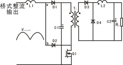 單級PFC AC-DC變換器中的PFC級和DC-DC級共用一個開關管和采用PWM方式的一套控制電路,同時實現功率因數校正和對輸出電壓的調節。