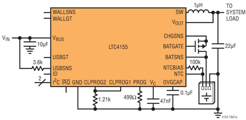 LTC4155的雙路輸入、優先級多路復用器可根據用戶定義的優先級(默認的優先級為適配器輸入)自主地選擇最合適的輸入(即墻上適配器或USB)。過壓保護(OVP)電路同時保護兩個輸入,以免這些輸入因無意間加上的高壓或反向電壓而損壞。LTC4155的理想二極管控制器保證即使輸入功率不足或未提供輸入功率時,也始終可向VOUT提供足夠的功率。