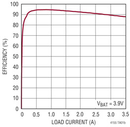 與典型的線性模式充電器相比,LTC4155中開關穩壓器的作用就像一個變壓器,允許VOUT上的負載電流超過輸入電源吸取的電流,并極大地提高電池充電的可用功率。前述例子說明了LTC4155怎樣才能以高達3.5A的電流高效率地充電,以實現更快的充電時間。與普通的開關型電池充電器不同,LTC4155可即時接通工作,以確保即使電池沒電或已深度放電,當一插上電源插頭,系統電源也立即可用。