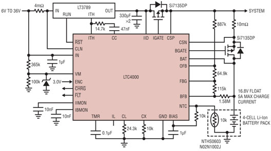 圖4:LTC4000和LTC3789:6V至36VIN、4節5A鋰離子電池充電器