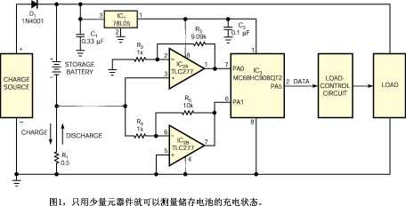 如圖1所示,電路包括一個8腳的飛思卡爾(Freescale)公司低成本MC68HC908QT2微控制器IC3。電流采樣電阻R1兩端的電壓會根據電池充電還是放電而轉換極性。IC2A和IC2B分別接成相同增益的非反相和反相放大器,用于檢測R1兩端的電壓。非反相放大器IC2A只響應充電電流產生的正向電壓,而對放電電流產生的負輸入電壓則提供零輸出。反相放大器IC2B則只響應負輸入,而對正充電電流提供0V。兩個運放的輸出都是正的,范圍從0 V至約5V,從而簡化了與ADC多路輸入的接口設計。IC2采用德州儀器(Texas Instruments)公司的TLC277,它的優點是占用印制電路板面積小,并有低的輸入失調電壓。