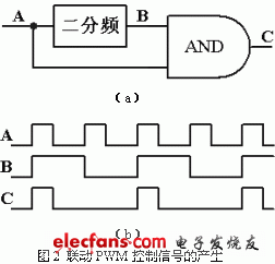 對于任一方波信號,要改變其占空比(對應(yīng)于導(dǎo)通時間,即信號處于高電平狀態(tài)的時間),一般有兩種實現(xiàn)途徑:一是改變其導(dǎo)通時間而頻率保持不變,二是改變其頻率而導(dǎo)通時間保持不變。本文采用后一種途徑,即用PWM控制器輸出的信號直接控制BUCK變換器,而在保持導(dǎo)通時間不變的情況下將其信號進行二分頻,得到占空比減半的信號來控制單端反激變換器。具體實現(xiàn)電路如圖2(a)所示,源信號經(jīng)分頻器二分頻,得到頻率減半的信號,再與源信號相與,即得到導(dǎo)通時間不變而頻率減半的信號。電路中各點波形參見圖2(b)。