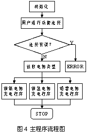 軟件系統(tǒng)采用模塊化設(shè)計方法,整個程序由主程序模塊、各類電池充電子程序模塊以及錯誤處理模塊組成,各模塊相對獨立,以便于算法改進及功能擴充,其中主程序模塊構(gòu)架了軟件系統(tǒng)的骨架,通過其對其他模塊的調(diào)用來實現(xiàn)完整的充電過程控制,其流程圖見圖4。