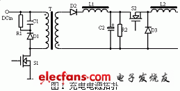 由于要求充電電源的輸出變化范圍為1.2V(0.3A)~60V(1.6A),采用單級變換器很難實現(xiàn)這 么大的變化范圍,故采用了兩級結(jié)構(gòu),電源主電路如圖1所示,交流輸入經(jīng)整流濾波得到穩(wěn)定的直流電壓DCin,首先經(jīng)單端反激變換器預(yù)穩(wěn)壓,并實現(xiàn)輸入級與輸出級的隔離,然后再經(jīng)BUCK變換器進一步降壓,得到所需輸出電壓。為了保證單端反激變換器能穩(wěn)定工作,加入了假負載R2。由于電池等效于一個大電容,故輸出端可不加濾波電容。
