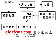由于充電方法相對較復(fù)雜,且需要對多種類型和規(guī)格的電池進行充電,故需要采用可編程器件進行控制,而單片機以其相對強大的功能和低廉的價格成為首選。本文選用Motorola公司推出的 MC68HC908GP32作為主控元件,整個系統(tǒng)的組成框圖如圖3所示,反映電池充電狀態(tài)的充電電流、電池電壓和溫度信號經(jīng)采樣電路送入單片機的A/D 轉(zhuǎn)換口,單片機根據(jù)充電算法,通過D/A轉(zhuǎn)換口輸出信號控制充電電源的電壓或電流給定,從而達到控制充電電源輸出的目的。