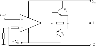 JTU―100型電子負載的原理圖如圖2所示,它最大可以吸收10A的電流,圖中V1、V2為調整管,Uref為可調基準源,1、2為輸出端,調節Uref的大小,不管負載如何變化,都可以在1、2端得到設定的電壓。