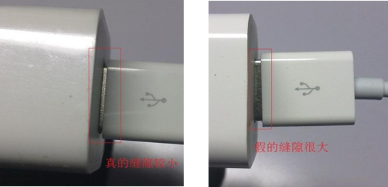 仿的充電器塑料外殼看上去色澤要么就是比較暗淡或者透著賊亮的感覺,摸起來的手感比較粗糙,圓角處理的也并不十分完美,插頭那面的文字比較模糊,綠點(diǎn)顏色比較深,接口的縫隙也比較大;插腳做工粗糙,在插頭前端還能明顯看到凹凸不平;連接上數(shù)據(jù)線要么很松要么很緊,而且仿的插頭比較淺,數(shù)據(jù)線的接口能露出一塊出來;連接數(shù)據(jù)線的口沒做原角處理。