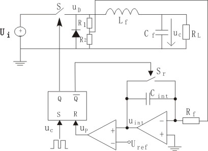 如圖6所示為單周期控制Buck變換器控制框圖,單周期控制技術實際上就是一種按擾動控制的開環控制系統。它將主功率電路的輸入電壓引入控制,隨著輸入電壓的變化,得到不同的占空度,使得主功率電路的輸出電壓跟隨給定量。理論上這種控制技術完全抵制了主功率電路的輸出電壓擾動,但是對負載的擾動卻無能為力。