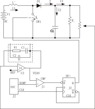 如圖2所示為電壓型控制Boost變換器控制框圖,電壓反饋控制技術是開關電源系統中經典的反饋控制方法。這是60年代后期開關穩壓電源剛剛開始發展就采用的第一種控制方法,該方法與一些必要的過電流保護電路相結合,至今仍然被廣泛的應用。