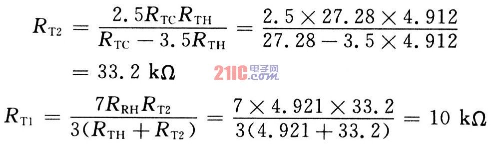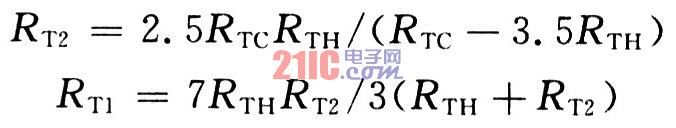 外部熱敏電阻RT1和RT2可以用來設置選擇溫度控制充電窗口,如圖6所示。假設RTH和RTC是熱敏電阻的高低溫極限值,RT1和RT2是負溫度系數熱敏電阻,則RT1和RT2可以用如下公式計算,先計算RT2,然后將RT2代入計算RT1: