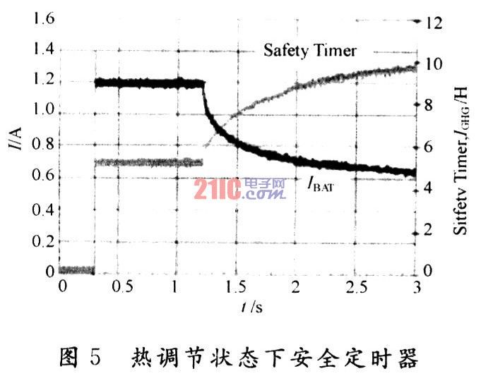 熱調節通常在快充早期階段進行,不過如果在CV模式下它仍然工作的話,充電電流就會過早達到充電終止閾值。為了避免錯誤充電終止,只要散熱調節回路在工作,電池充電終止功能就會被禁用。此外,有效充電電流降低會延長電池充電時間。如果充電安全計時器有固定設置的話,就會過早終止充電。BQ24060采用動態安全計時器控制電路,能在熱調節階段有效延長安全時間,并盡可能降低安全計時器的故障幾率。從圖5中可以看出,熱調節模式下的安全計時器的響應與有效充電電流成反比。