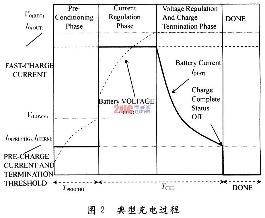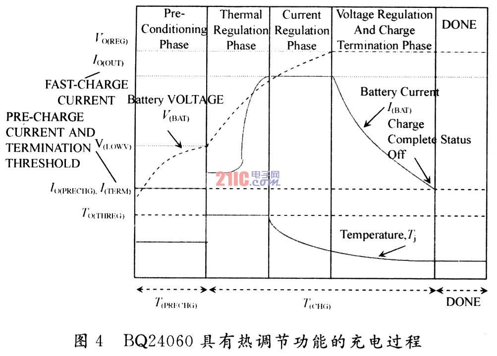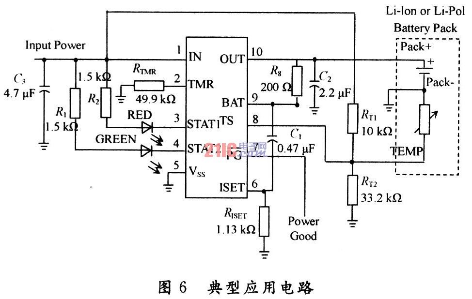 如果非理想的工作條件引起IC結溫達到極限值Tj,充電循環激活內部控制回路系統將被調節,并控制其它充電控制回路,進而減小充電電流,直到IC結溫小于Tj,使IC工作于安全溫度下。