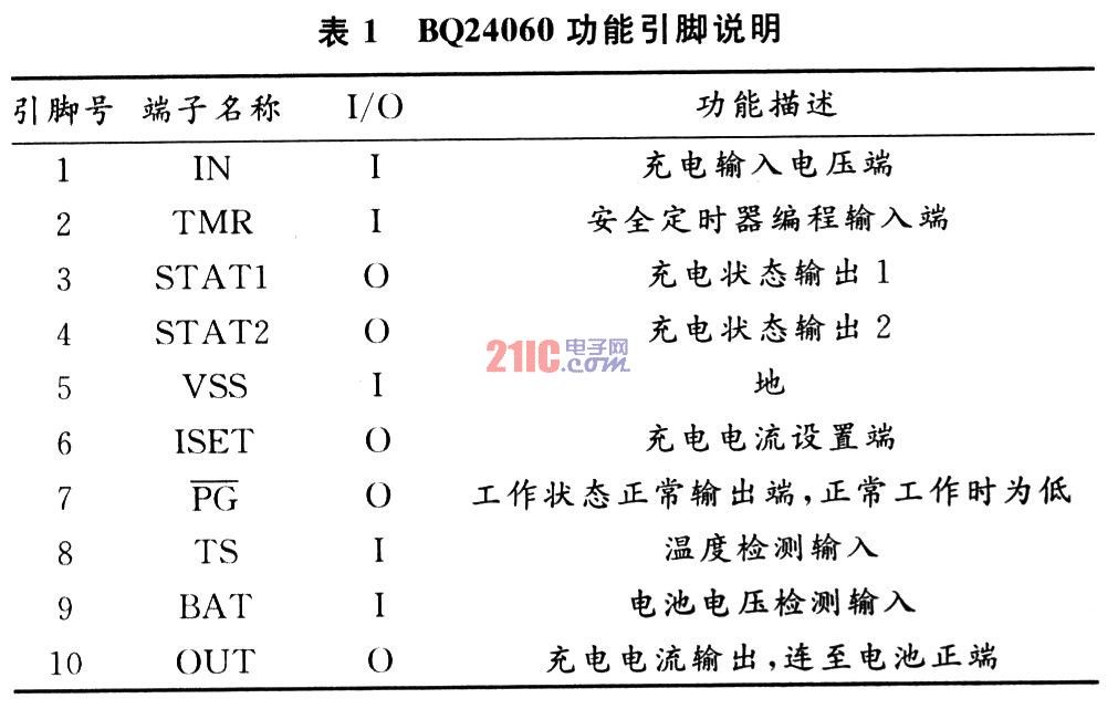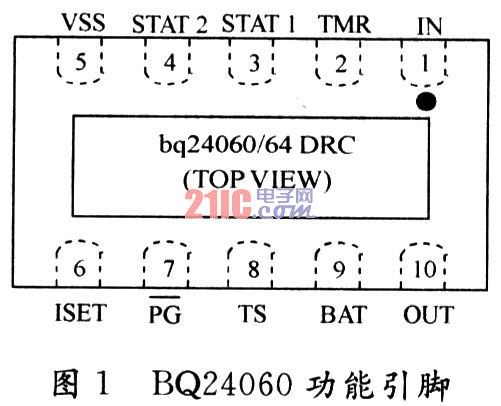 BQ24060是TI公司的一個高集成的鋰離子電池充電管理IC,其功能引腳如圖1所示,表1介紹了各引腳功能。BQ24060提供能在有限空間里完成多功能的、安全的滿充電的鋰離子電池充電器設計,其內部集成了1 A功率FET以及電流傳感器,因而能夠承受高達26 V的輸入電壓。該產品還提供具備獨特安全與低壓降特性的全面充電管理功能,以延長電池使用壽命。BQ24060可以使鋰離子電池分三階段進行充電:預充電方式、恒流熱調節充電方式、精確恒壓充電方式。充電終止是基于一個最小電流。內部可編程充電定時器為充電終止和在熱調節狀態動態調節提供安全保障。